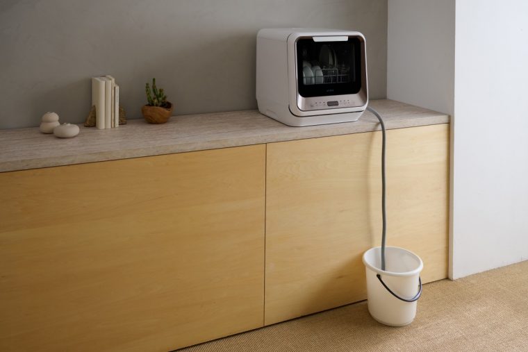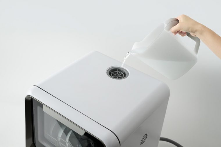 本製品は、付属の給水カップで、本体上部から水を注ぐ「タンク式」を採用した1~3人家族向けの食器洗い乾燥機。水道工事不要で、購入したその日からすぐに使い始めることができます。