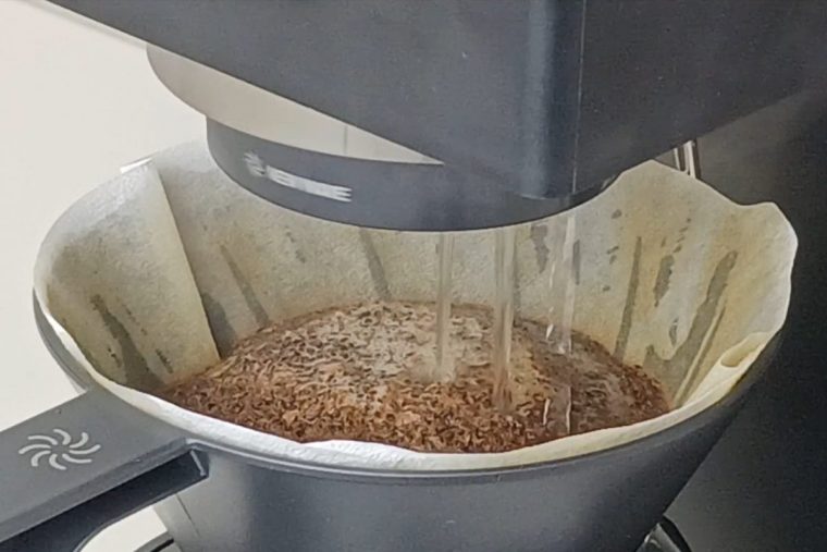天野氏の「優しく注ぐことで豆を均一に蒸らし膨らませる」といった抽出の動きを再現。コーヒー粉の⼭を崩さないようにゆっくり注ぎながら、内側から全体に浸透させ、じっくり豆の成分を引き出します。