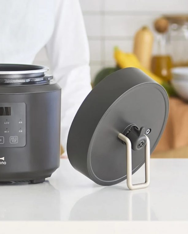 上質なマット仕上げの本体と、真鍮調のハンドルが印象的なデザインは、使わないときにそのまま出しておきたくなる佇まい。さらに、自立式の蓋を採用しているので、調理中の置き場にも困りません。パーツは分解して洗えるので、お手入れもラクラクです。