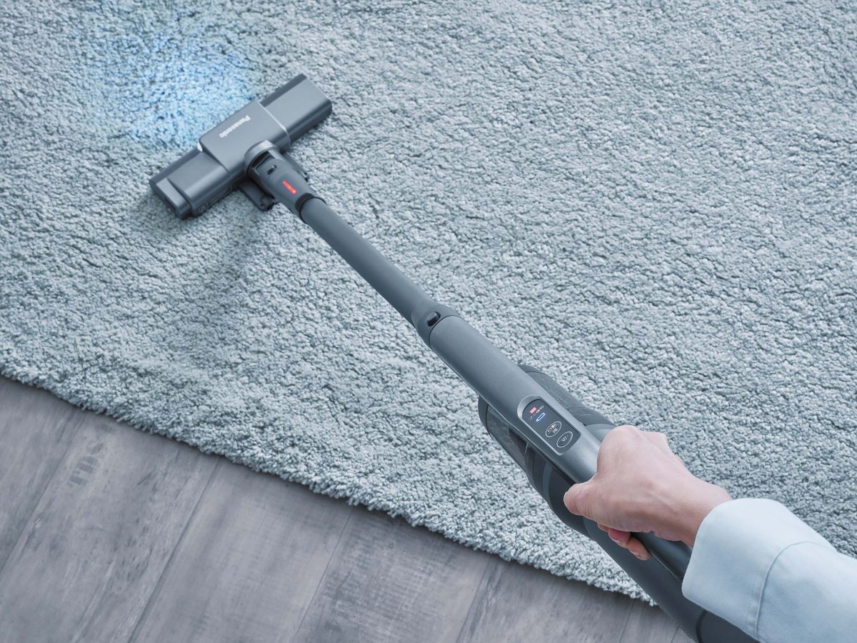 約18%軽量化しながら、高出力モーターの採用によりパワーが約18%向上。ヘッドにお掃除シートを装着し、ゴミを吸引しながら拭き掃除もできる。