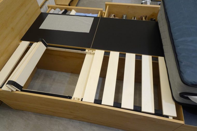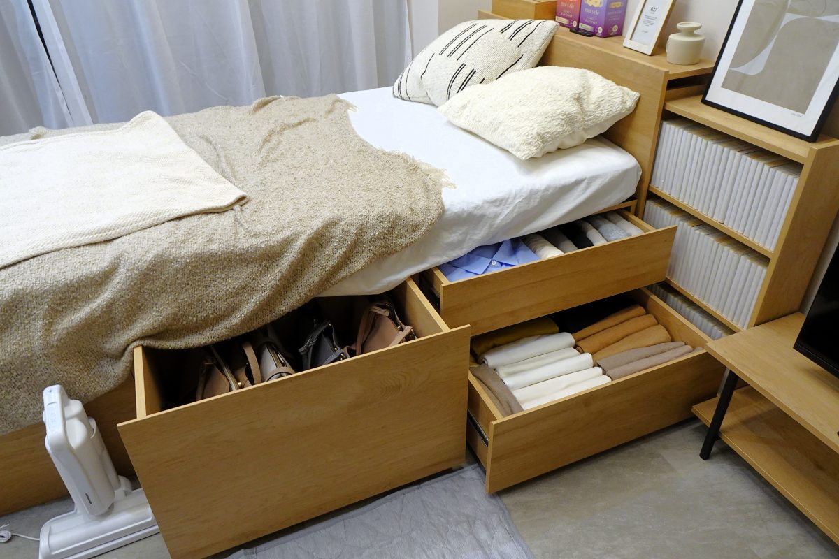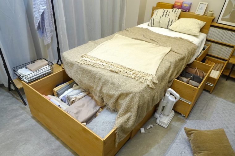ベッド下のスペースを有効活用し、家具を増やさず収納量を大幅に確保できる「超収納ベッド」シリーズのラインナップの1つ。その中でも、スライド本棚付きでヘッドボード収納を最大化した“収納宮タイプ”。ダブルサイズの場合は、フット引き出しを含む合計10個の引き出しにより、引き出し容量約633.3L。さらに、すのこ下のフリースペースを含めると約 864.4Lとなり、アイリスオーヤマが販売しているウッドトップチェスト換算で約8.6個分に相当する収納力を実現しています。
