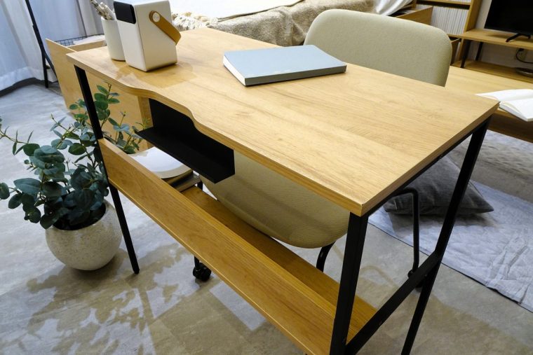奥行39.5cmのコンパクトサイズで、リビングやワンルームにも置きやすいリビングデスク。ノートPC作業や書き物にちょうどいい奥行を確保しつつ、圧迫感を抑えたシンプルな設計。天板下には小物を収納できるオープンスペースも備えています。