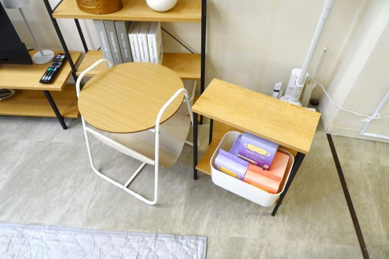 ソファ横やベッドサイドにすっきりと収まるコンパクトなサイドテーブル。奥行約18cmのスリムな設計で、飲み物・スマホ・リモコンなどを省スペースでまとめられます。天板は木目調でインテリアになじみやすく、下段の棚には雑誌や小物を収納できます。