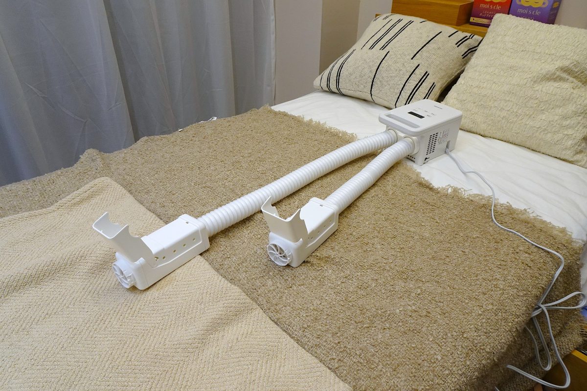 コンパクトながらパワフルな1380Wヒーターとツインノズルを搭載。ふとんの両側へ同時に温風を送り込み、あたためは最短約2分、乾燥も短時間で仕上がる。マット不要でノズルを差し込むだけの手軽さ。棚やすき間にも収納しやすいサイズ感です。