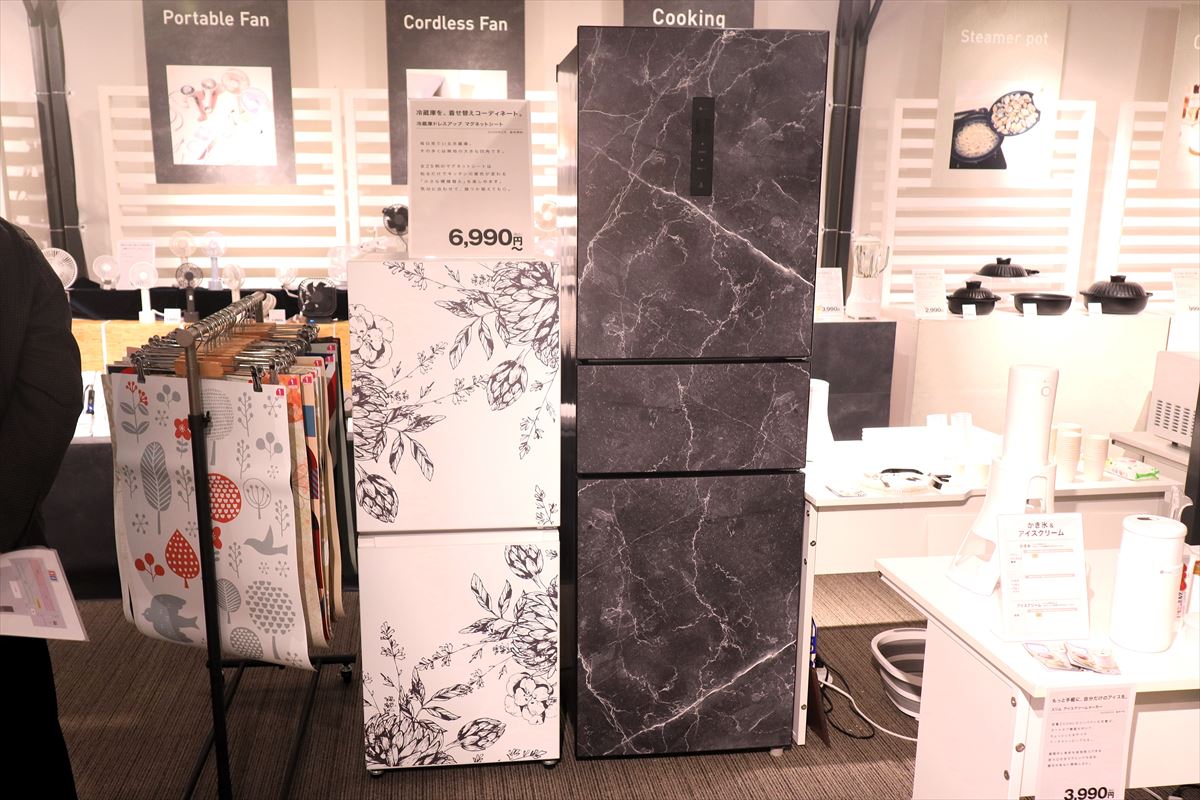 ユニークだったのが冷蔵庫のデザインを気軽に変えられる「冷蔵庫ドレスアップ マグネットシート」。冷蔵庫のドアにマグネットで貼り付けるもので、季節や気分、インテリアコーディネートに合わせて気軽に冷蔵庫を着せ替えできます。88Lから271Lまでの6タイプ用にそれぞれ25柄を発売。価格は6990~1万3990円。
