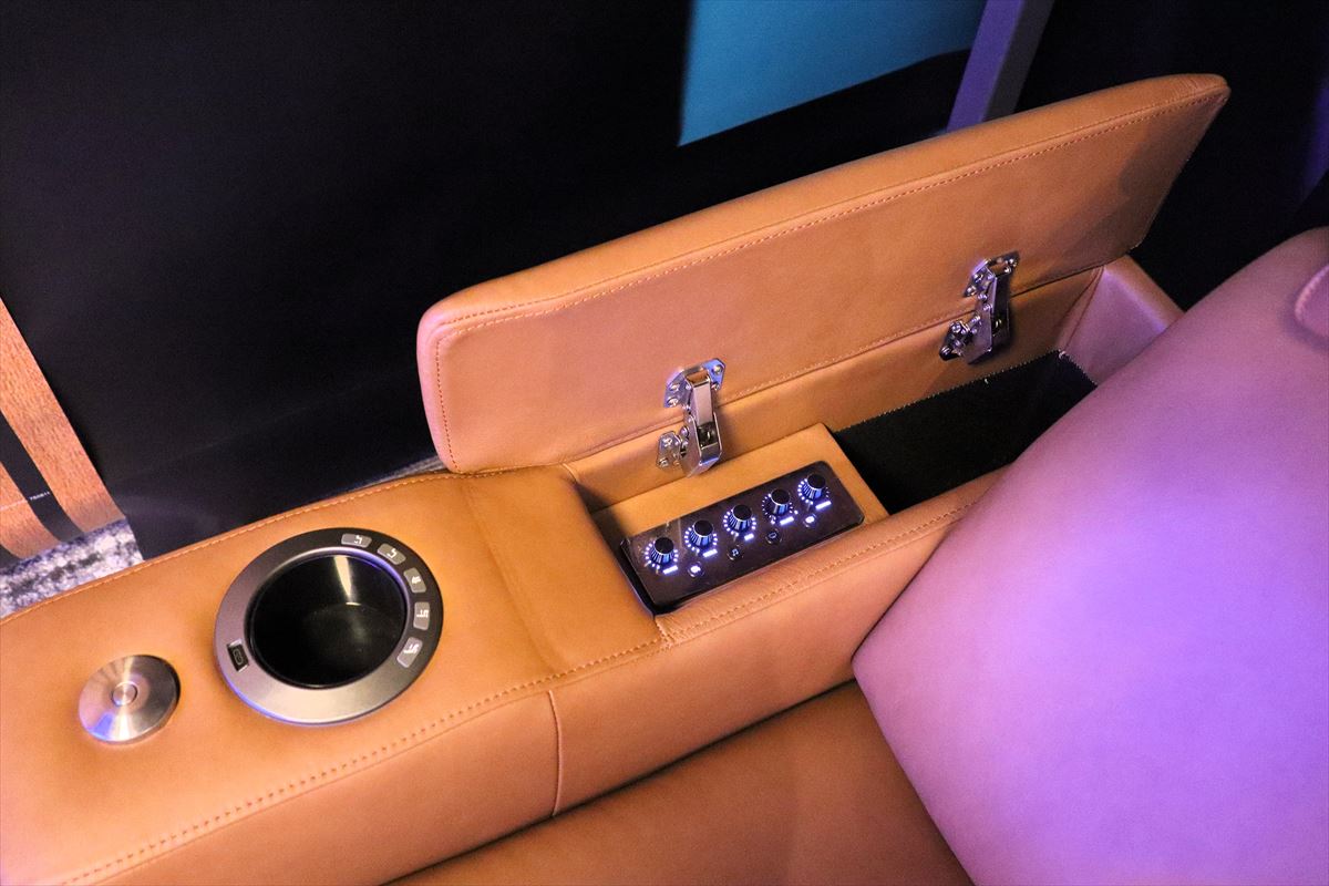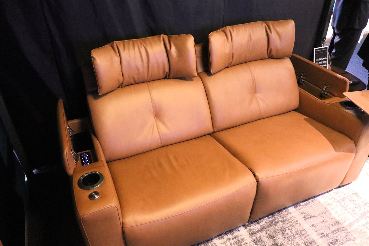 5月には「シアターソファ」も発売します。ヘッドレスト部分にスピーカーを内蔵し、耳元で大迫力のサウンドを楽しめます。加えて、シアターモードにすると映像の重低音に合わせて座面のバイブレーションが稼働して臨場感を楽しめます。手元の操作部で音質の調整やモード変換、リクライニングの操作が可能。3人掛けで、価格は24万9900円。