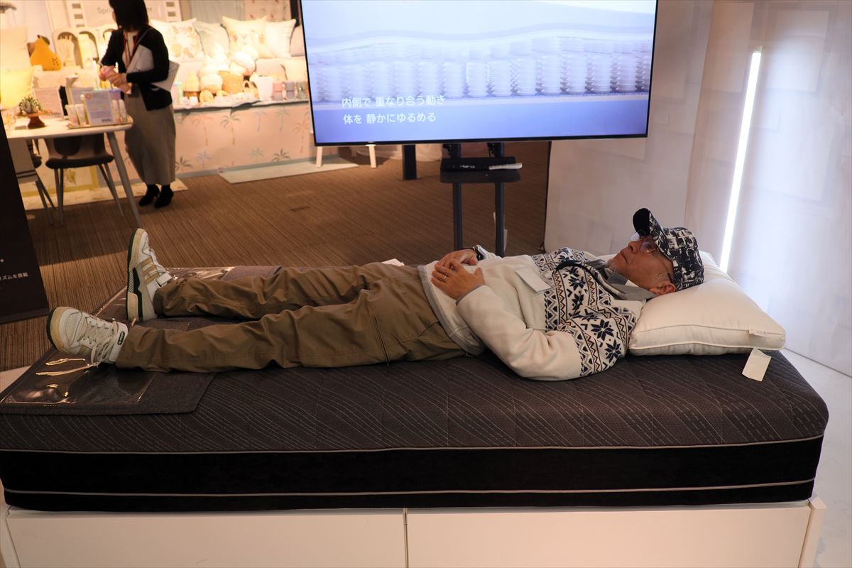 1つは似鳥会長の挨拶にあった「AIマットレス」(4月発売)。人が寝転がると自動的にセンシングを始め、AIが身長・体重・体型・寝姿を分析して、内蔵するエアスプリングのかたさを自動で調整。腰や膝のくぼみなど体の凹凸にフィットした形とかたさになり、心地よい寝心地を確保するものです。寝返りなど姿勢が変わるたびにセンシングと調整を行うとのことです。やわらかめ、かためといった自分好みに調整も可能。体の部位を指定してストレッチする「リラックスモード」や、やわらかいリズムの「波モード」も搭載しているほか、腰から下を約30℃にあたためるヒーターも搭載。