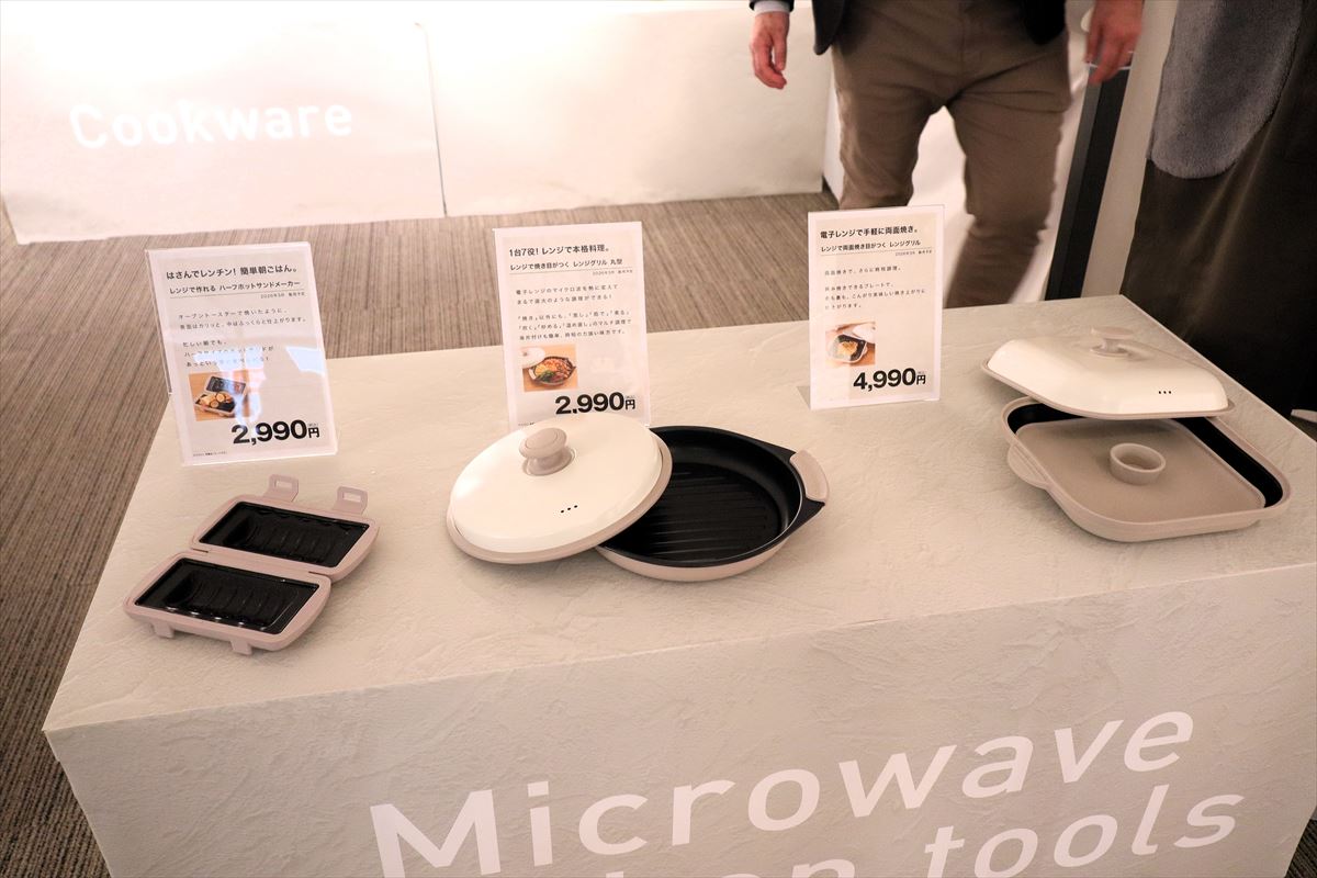 家電ではないのですが、キッチン分野で注目を浴びていたのが、電子レンジで調理する器「レンジグリル」シリーズでした。「レンジで焼き目がつくレンジグリル丸型」(2990円)はマイクロ波を熱に変えて食材に焼き目をつける「焼き」調理以外にも、蒸し・茹で・煮る・炊く・炒める・温め直しができる1台7役。挟み焼きできるプレートで両面がこんがり焼ける「レンジで両面焼き目がつくレンジグリル」(4990円)、1枚の食パンを折りたたんでホットサンドが作れる「レンジで作れるハーフホットサンドメーカー」(2990円)、炊く・茹でる・蒸すができる深型ポットの「レンジで煮込めるレンジグリルポット」(3990円)もラインアップ。いずれも3月の発売です。