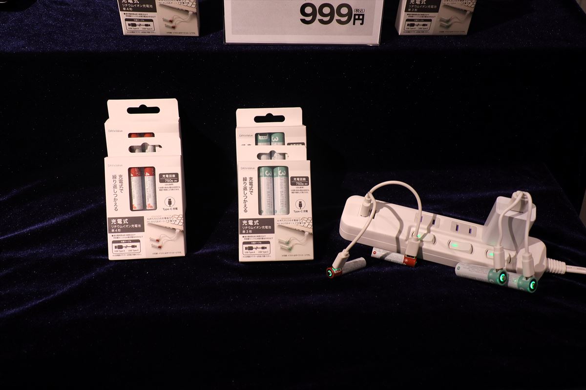 このほか、1月に発売して話題となっている「USBリチウムイオン充電池」も展示されていました。専用充電器を使わず、直接USBケーブルを挿すだけで充電可能な充電池で、単3形と単4形をラインアップ。ともに2本入りで999円です。