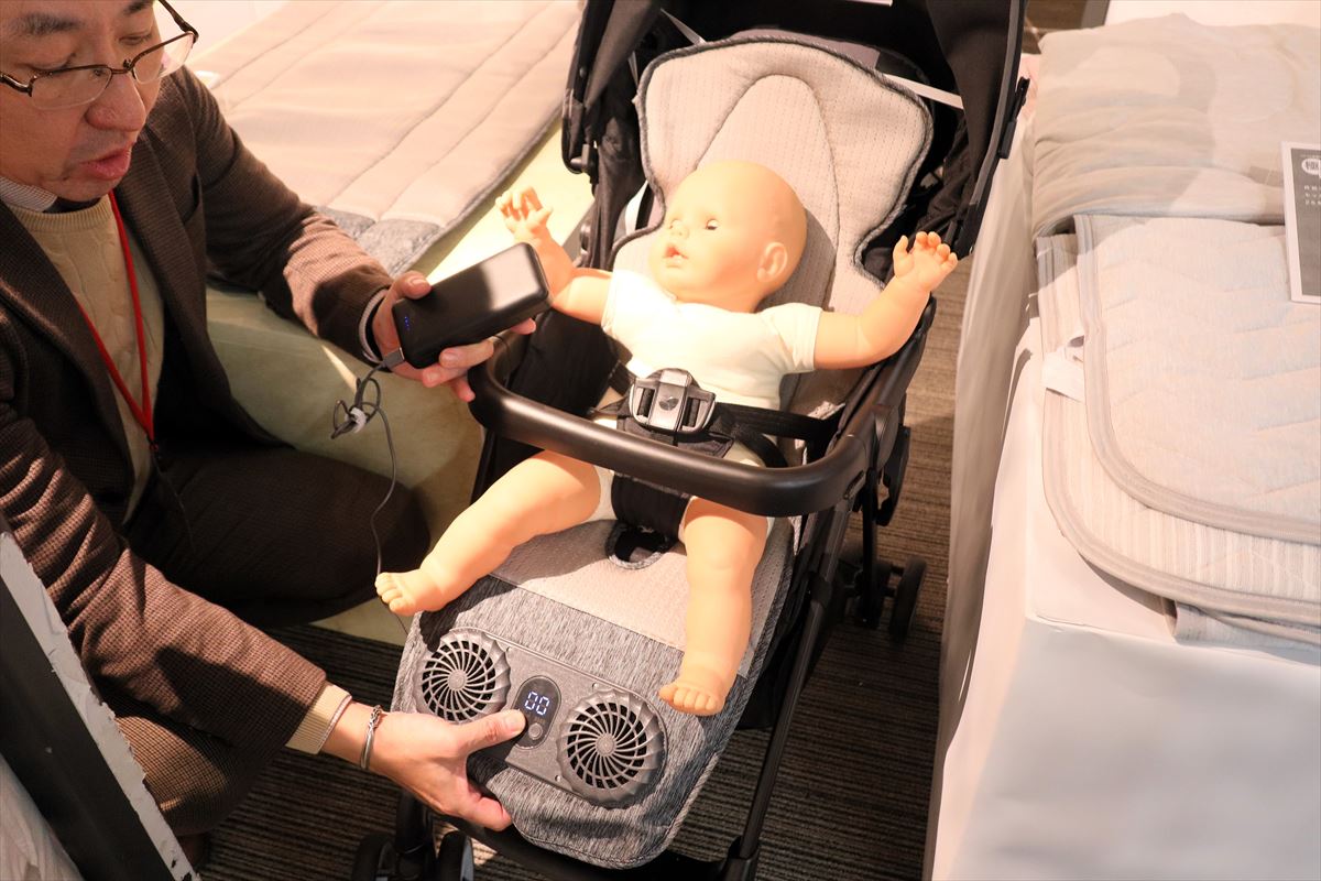ベビー用品の新製品も目を引きました。「Nクール ファン付きお昼寝マット」(9990円)は、冷感素材を使用した生地にWファンで風を通し、蒸れやすい乳幼児の背中まわりを涼しく快適に保ちます。風が強すぎると乳幼児の肌に影響を与えてしまうため、涼風のような優しい風を送る工夫がされています。