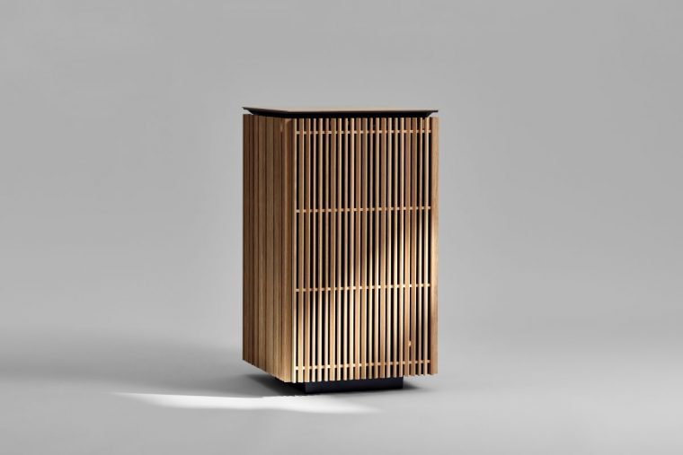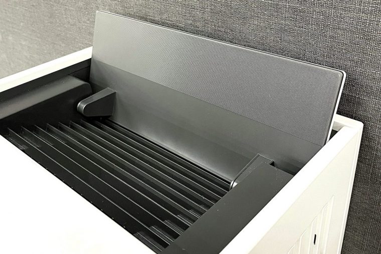この格子は、単にスリットを入れれば成立するものではない。隙間の幅や奥行き、角度、段差のつけ方によって、家具のように見えるか、家電の吸気口に見えてしまうかが大きく変わるためだ。江尻氏は「ほんの0.数ミリの違いで印象が変わるため、試作を重ねて最適なバランスを探りました」と語る。