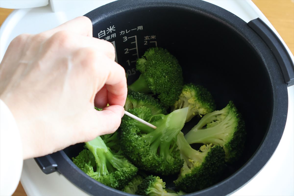 まずはブロッコリーから。内釜に水を大さじ2、小房に分けたブロッコリー(200g程度)を入れます。フタを閉めて「調理」ボタンを押し、「クッキング 1/7分タイマー」に設定して、「炊飯/スタート」ボタンを押すだけ。