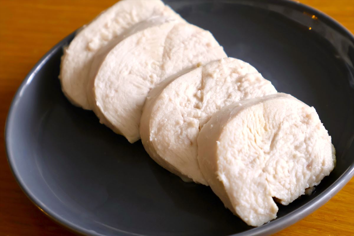 続いては、鶏むね肉を使った「ゆで鶏」のレシピを。いわゆるサラダチキン的なヤツですね。