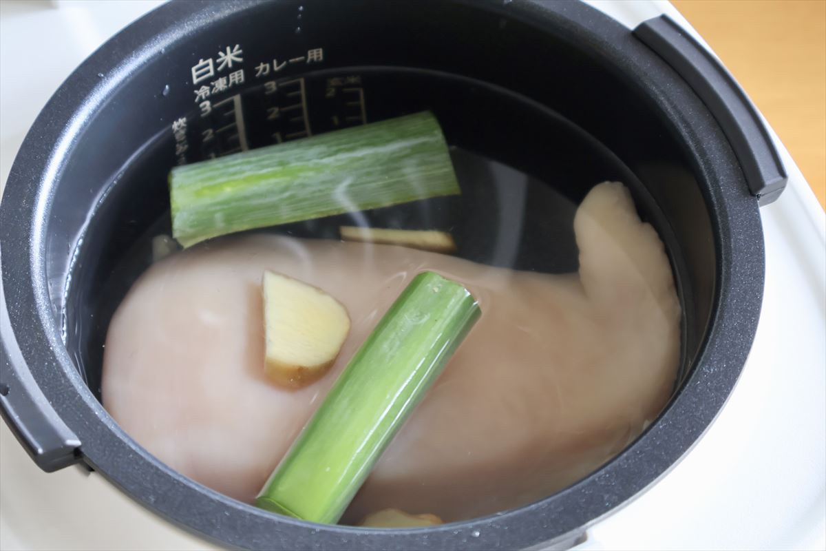 手順としては、内釜の水位目盛「2」まで水を入れて塩小さじ1を溶かし、そこに鶏むね肉(300g程度・厚さ3cm以下)と白ネギの青い部分(5cm)、ショウガの薄切り(ひとかけ)を入れてセットするだけ。あとは、フタをして「調理」ボタンを押し、「クッキング2/30分タイマー」を設定して「炊飯/スタート」ボタンを押せばOKです。こちらは、加熱準備時間を含めたトータルの所要時間は42分ほどでした。
