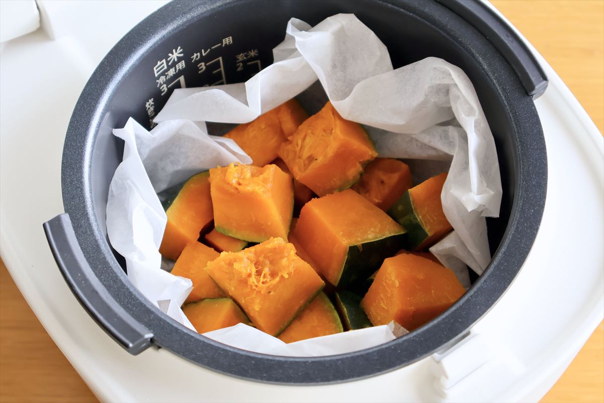かぼちゃ(300g程度)は3〜4cm角にカットし、大さじ3の水と合わせて10分タイマーで加熱。こちらはカット具合によって、少し火の通りが心許ないことも。しかしそんなときも、もう一度フタを閉めて延長加熱することができるので、様子を見ながら調整できます。