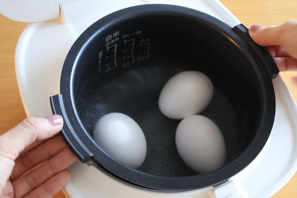手順としては、内釜に生卵を入れ、卵がかぶる程度の水を加えて本体にセットしたら、「クッキング3/20分タイマー」に設定して「炊飯/スタート」を押すだけ。Mサイズの卵を一度に4個まで同時に調理できます。