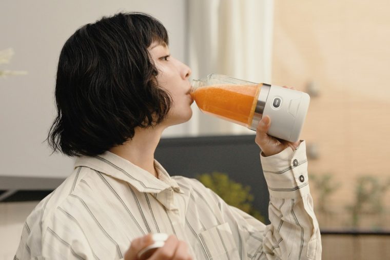 本製品は、バッグにも入れやすいサイズ感で、持ち運びに便利なホルダー付きのブレンダー。USB充電式(タイプC)のコードレスなので、いつでもどこでも作りたてを楽しめます。