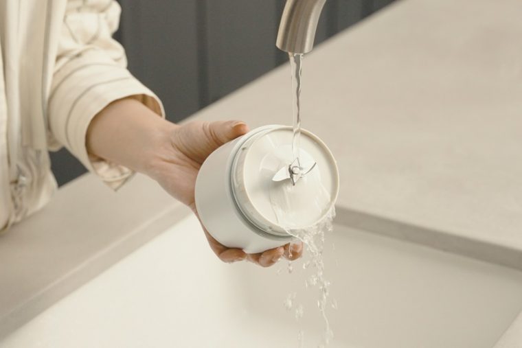 持ち運んでどこでも使える充電式のブレンダー。外出先で冷凍フルーツや氷を購入して、手軽に作りたてのジュースやスムージーを作ることができます。防水仕様で手軽に洗えるのも便利。