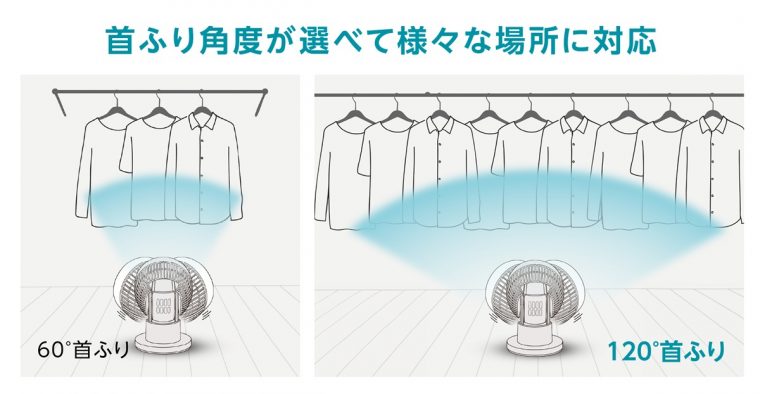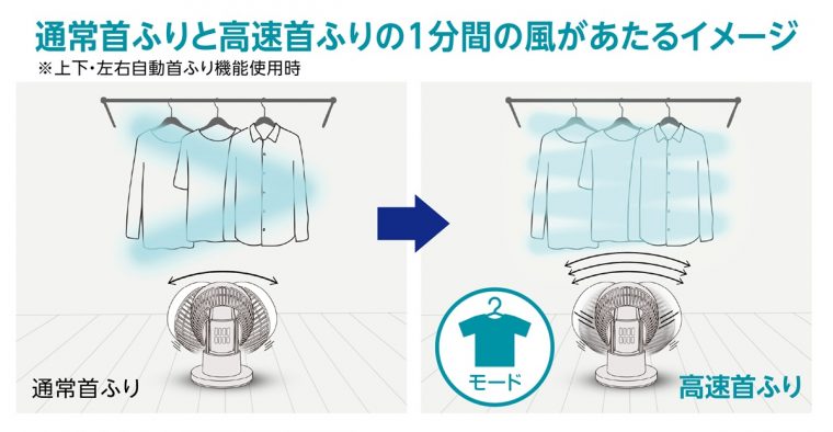 本製品は、従来のサーキュレーターの2倍の速度で首ふりをするので、より早く広範囲に空気を送ることで衣類を早く乾かすことができるのが特徴。上下60度・90度、左右60度・90度・120度の範囲で首ふりを設定できます。サーキュレーターの設置場所や部屋干しの洗濯物の量によって、角度を調整して効率よく衣類乾燥の補助ができます。