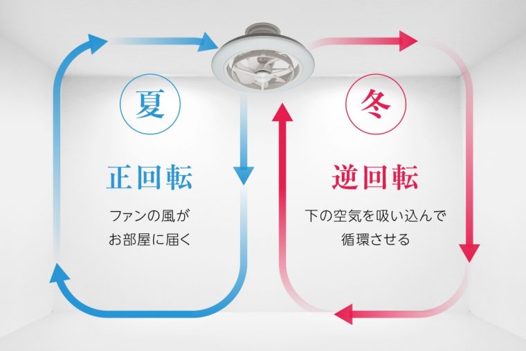 夏は正回転(下向き)でファンの風をお部屋に届け、冬は逆回転(上向き)で床付近の冷たい空気を吸いこんで循環させることができ、オールシーズンで活躍します。