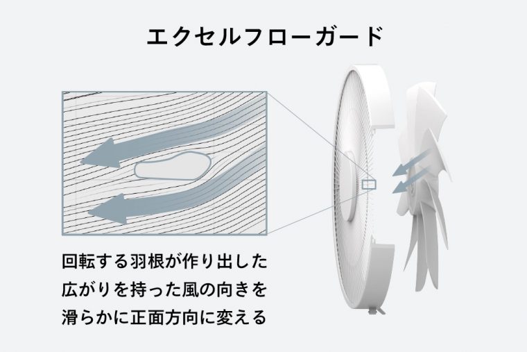 本製品では前ガードの設計を見直し、新たに開発された「エクセルフローガード」を搭載。こちらは、ジェットエンジンの“静翼”から着想を得て設計し、空気抵抗を抑えながら風の向きを整えます。これにより、風の直進性が高まり、運転音を上げずに風速が従来機種と比較して約20%向上しています。