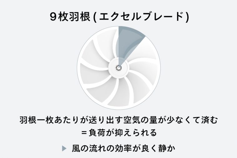また、ジェットエンジンの羽根を設計する専門企業ターボブレード社と共同開発した9枚羽根の「エクセルブレード」を採用。効率的に風を送るため、羽根の先端から根元ま最適な断面形状・角度となるよう精密に設計されています。