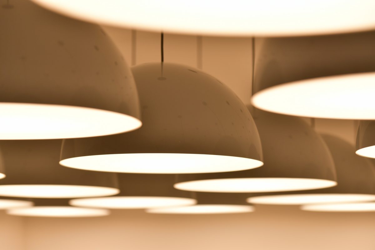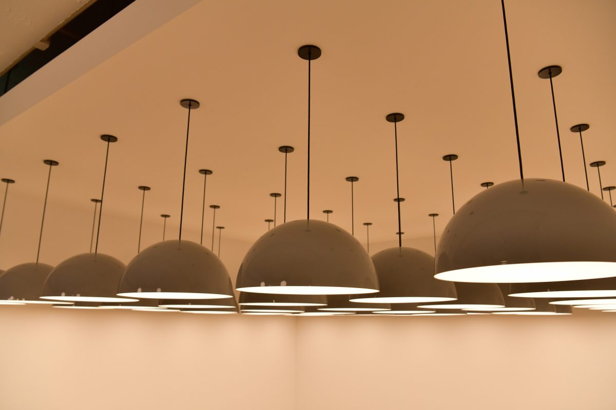 展示では、数多くの半球照明が、間隔を詰めて均等に並べられていた。スペースの中央がほぼ均一に明るく見えた一方で、壁際ではやわらかな光のコントラストができているのが印象的だった。この光がもたらす柔和な雰囲気は、現在主流のダウンライトやシーリングライトでは実現できないものだ。