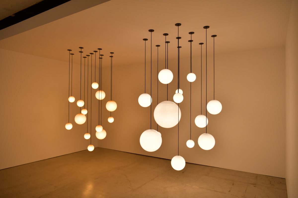 この照明は球の上部に金属製の部品を用いていないため、より真球に近い形状に見えるのが大きな特徴のひとつだ。だが、照明が高い位置に吊られていると上部が見えず、その特徴を体感するのが難しい。そこで今回の展示では、あえて低い位置に照明を配置することで、長所がはっきりとわかるようになっていた。