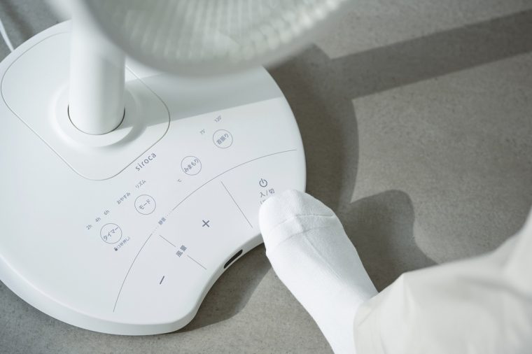 シロカのアンケート調査によれば、扇風機を「足で操作したことがある」「ほとんど足で操作している」と答えた人は全体の約80%にも上ります。このほか、「手で押さないとだめだと分かっていても、しゃがむのが面倒」といった声も。そこで開発されたのが、この「しゃがみま扇」です。大きなボタンで足での操作がしやすく、手がふさがっているときなども簡単に操作できます。