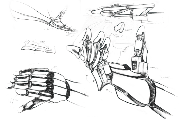 現在の筋電義手の問題を克服するべく開発された初代モデル「handiii」のデザインスケッチ。利用者が着けたくなるデザインをめざしたとのこと。
