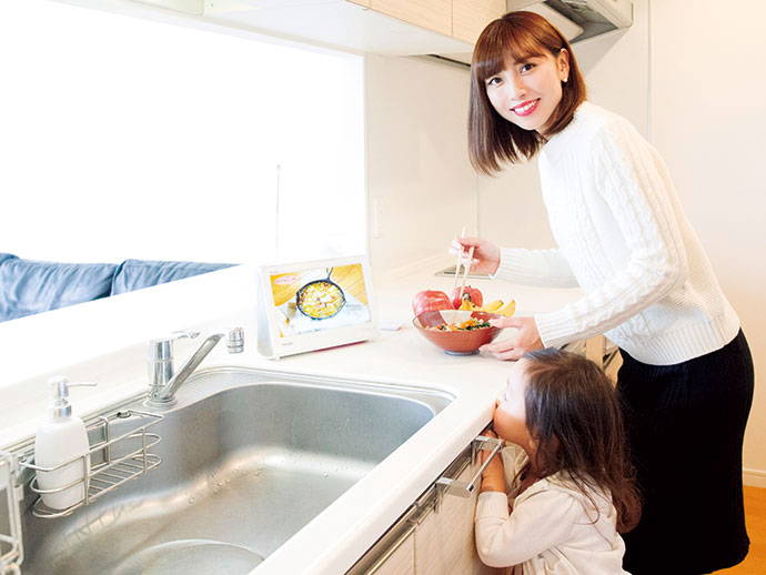 「洗い物中の濡れた手でも操作できるのが、すっごく便利! 子どもが汚れた手で触ってもサッと水拭きできるから衛生的ですし。あと、やっぱりお風呂で使えるのが一番うれしい! リモコンまで防水対応になっているから、ゆったりお湯につかりながら、ザッピングできて楽しいです」(岡部)