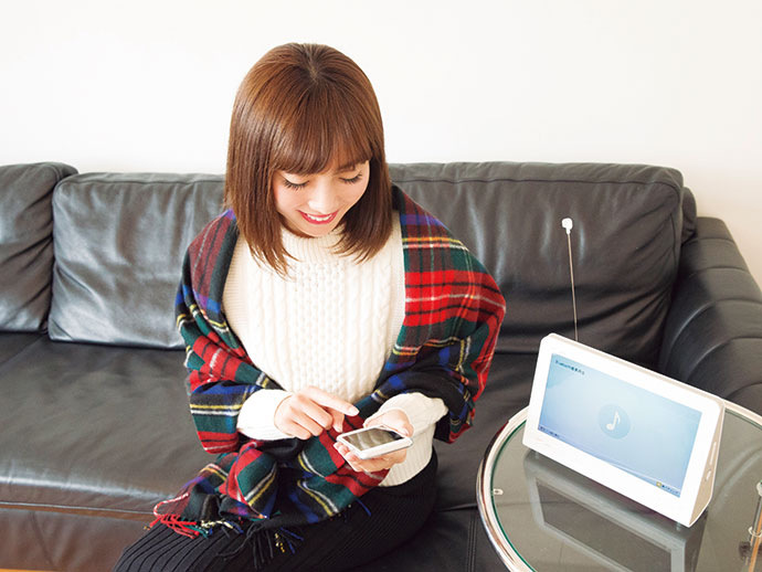 普段は家事中にスマホの音楽を流すという岡部さん。スマホと本機をBluetoothで接続すれば、スマホに保存した音楽を40㎜の大口径スピーカーで再生できます。「スマホで聴くより断然イイ音! 接続の操作もカンタン」(岡部)