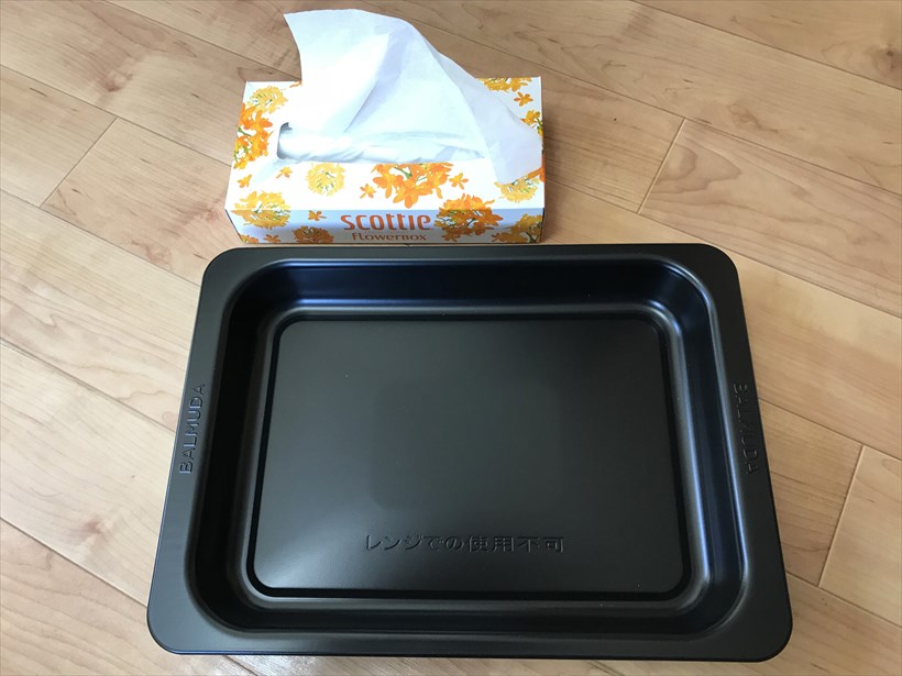 さて、本機でもうひとつ、忘れてはならないのが、オーブン用の角皿の存在です。幅365×奥行264×高さ42mmというちょうどいいサイズ。ネット上でその使い方の例(上写真)を見て震えました。なんてリア充(※)なんだろう……。陽だまりのなかで、丸鶏にナイフを入れるかッ…!