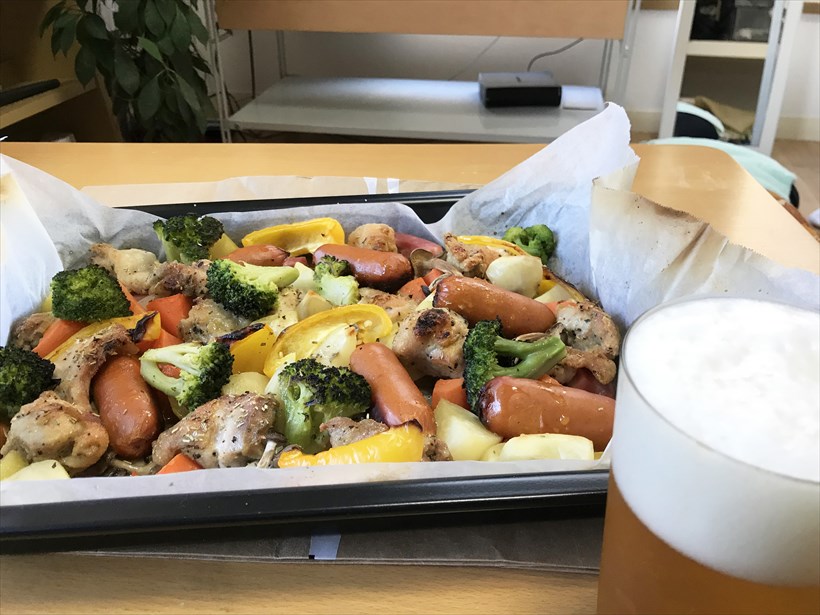 「ジャララン」とギター音が鳴って完成。ちょっと焼きすぎてしまいましたが、上出来ではないでしょうか。食べてみると、全部の食材がジューシーで香ばしいです。玉ねぎひとつとっても最高にウマイ。時は土曜の昼下がり、先日の風邪は抜けきっていませんが、これは飲むしかないでしょう!