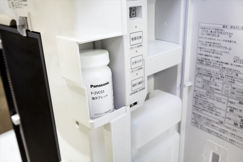 ↑ジアイーノは水と塩タブレットを使って次亜塩素酸を作ります。製品内部にはタブレットを収納するスペースを用意