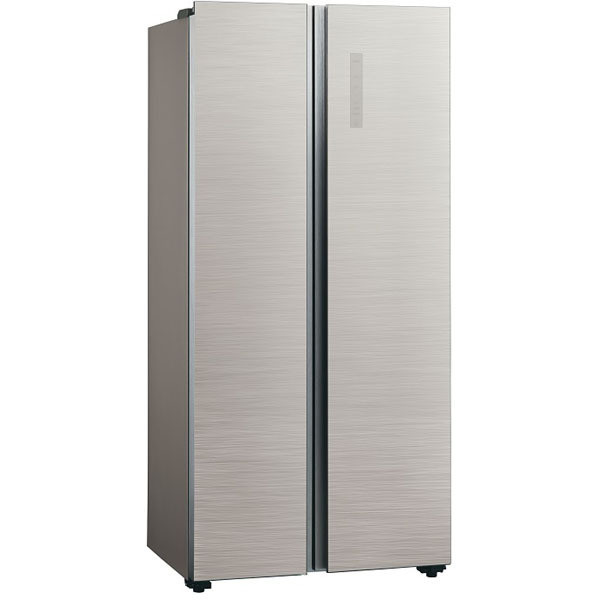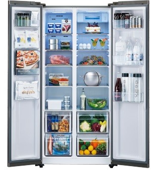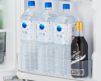 「大きな二枚扉の観音開きで、左右に冷凍室、冷蔵室が並ぶ『サイド・バイ・サイド』タイプは、日本では珍しいデザインです。扉を開けると中が引き出し式なのも欧米の冷蔵庫に多い仕様。ちょっとセレブな欧米スタイルが満喫できます。左右で冷蔵、冷凍に分かれているため、よく使う食材を取り出しやすい位置に収納できるのも特徴。フリーザーは183Lと大容量で、お取り寄せした食材もたっぷり長期保存ができます。やや惜しいのが省エネ性。年間消費電力量400kWhはそれほど高いわけではないですが、大容量モデルには200kWh台の優秀なモデルも多くなります(※)。このあたりを納得した上でご購入を!」(戸井田さん)
