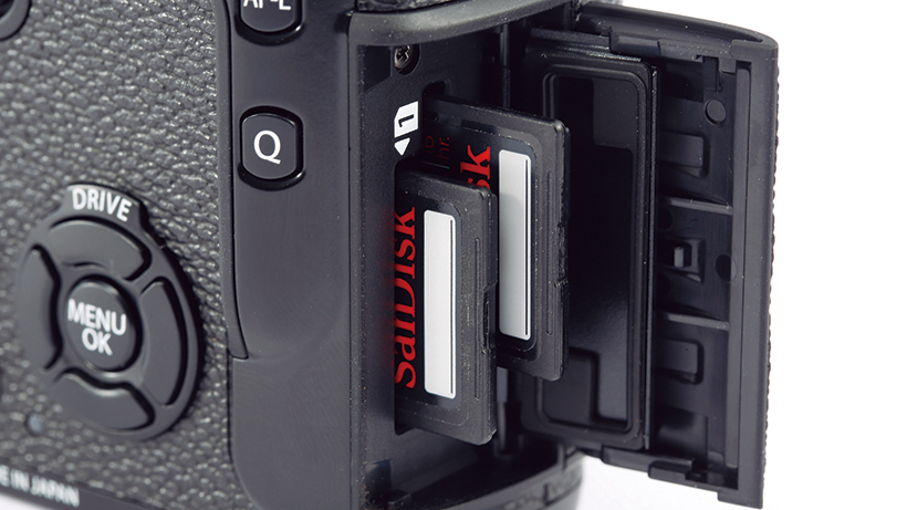 SDカードのデュアルスロットをミラーレス機として初採用。スロット1は高速書き込みが可能なUHS-Ⅱに対応します。