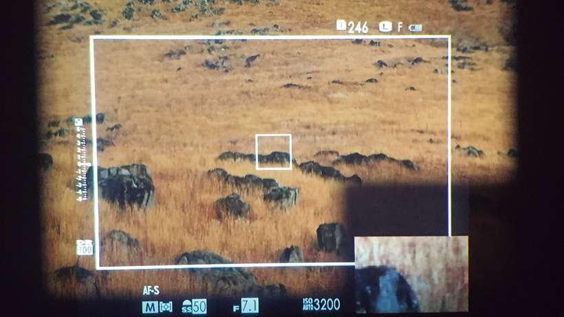 OVF時は、レンズの画角に応じた枠(ブライトフレーム)が表示。画面右下にピント位置の拡大表示もできます。