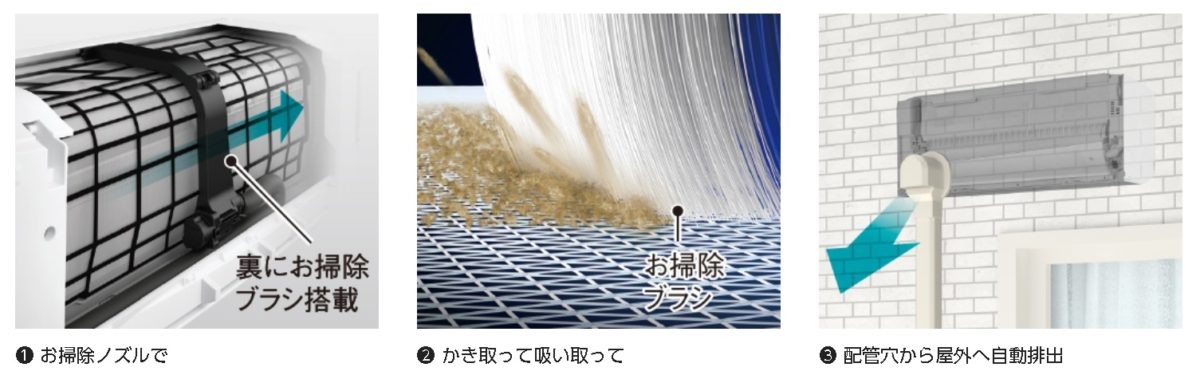 「こちらは上から4番目のグレードです。フィルターお掃除ロボットの自動排出方式搭載なのに、設置性が良いのがウリ。これより下のグレードは、ダストボックスに集めたホコリを手動で捨てる方式になります。人がいるかいないかを見分けて省エネ運転をする『不在省エネ』や『オートオフ機能』、部屋の特性を学習する『おへや学習機能』、『日射センサー』などはしっかり搭載しており、省エネと快適性をソフト面でカバーしています。