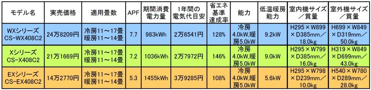 Xは高性能でWXよりコンパクト。EXはエアコンをスッキリ見せたい人に