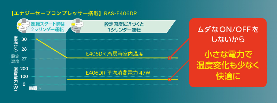 最近の住宅は高気密・高断熱になっているだけに、温度が安定したときに電力が少なくてすむ『エナジーセーブコンプレッサー』の技術が活きてきます。ですから本機の場合、少しの外出(冷房1時間・暖房30分目安)でオンオフするのはやめて、ずっとつけたままにするのがオススメ。長時間エアコンを使う人ほど、電気代がおトクになりますよ!」(戸井田さん)