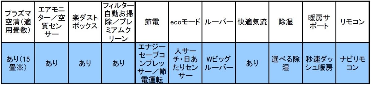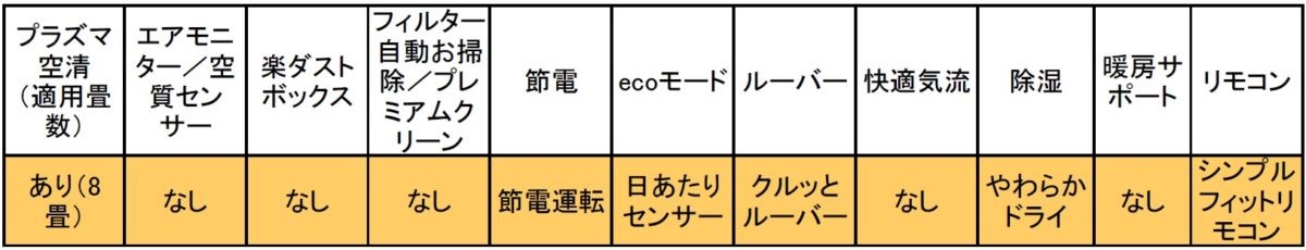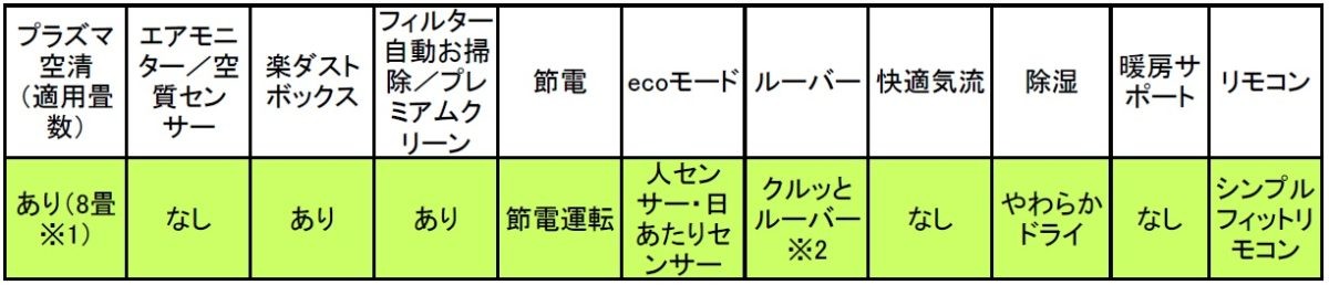 センサーは、『人サーチセンサー』と『明るさ〔日あたり〕サーチセンサー』の2つ(最上位も同じ)。『ecoモード』やボタンひとつで省電力運転を行う『節電運転』など、節電機能も上位機種と同等です。ただし、『エアモニター』『Wビッグルーバー』『快適気流』は非搭載(※)。APFは4.9と、基本性能は上位機種に比べるとやや落ちます。