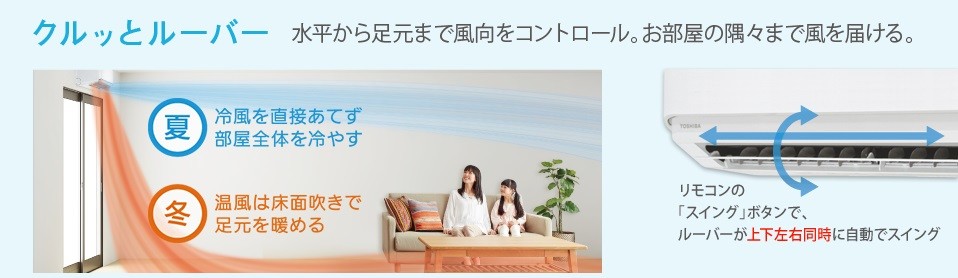 上位機種と同じく、東芝独自の「プラズマ空清」を搭載したコンパクトモデル。PM0.1レベルの微細な粒子も集めて帯電し、熱交換機に吸着して屋外に排出します。フィルターの自動お掃除機能はありませんが、除湿や冷房時に発生した水が熱交換器の汚れを洗い流す「マジック洗浄熱交換器」を搭載。運転停止後、プラズマ乾燥で送風路内のイヤなニオイも脱臭します。水平から足元まで風向をコントロールする「クルッとルーバー」で部屋の隅々まで風を届けます。