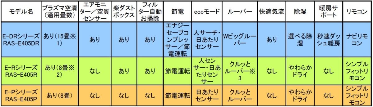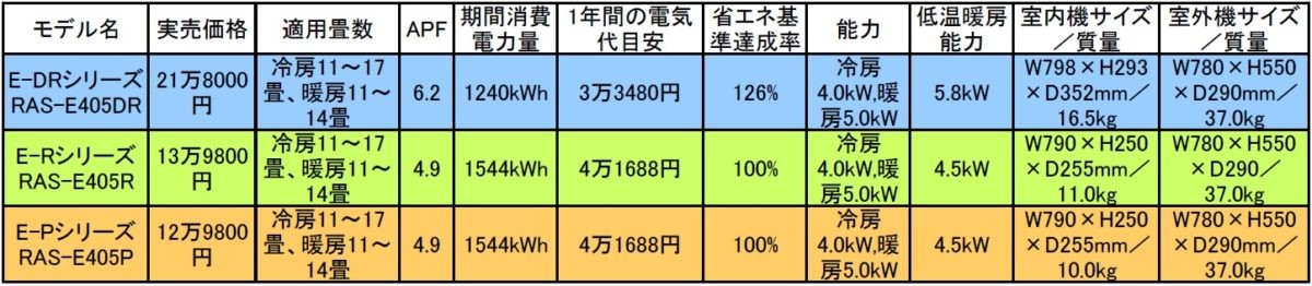 「E-DRシリーズは、すべての機能が搭載されているフルスペックモデル。独自のコンプレッサーを搭載し、基本性能が高いのが最大のウリです。在室時間が長いリビングや寝室などにオススメ。6畳(2.2kW)~26畳(8.0kW)まで全ラインナップが揃っているので、どんな大きさの部屋でも選べるのもこのグレードの特徴です。14畳(4.0kW)は100V(品番:RAS-E405DR)と200V(品番:RAS-E406DR)があり、200Vの方がAPFが高いので、より省エネ性能を求めるなら200Vで計画を!