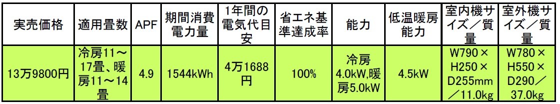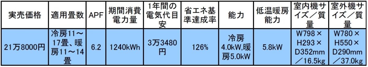kWで表される「能力」とは、単位時間当たりに室内から取り除くエネルギー、または室内に与える熱エネルギーのこと。この数値が大きいほど広い部屋に対応します。今回はリビングで使われることが多い14畳用を想定し、冷房能力4.0kWのモデルを紹介しています。