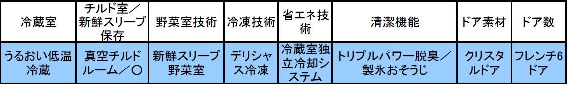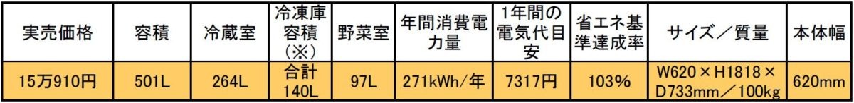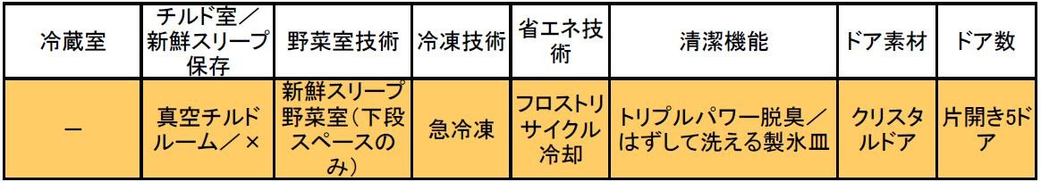 幅620mm、片開き5ドアのスリムモデル。真空環境によって酸化と乾燥を防ぐ「真空チルド」を搭載するほか、野菜の呼吸活動を抑えて長持ちさせる「新鮮スリープ野菜室」は下段のみに搭載。冷凍技術は「デリシャス冷凍」は非搭載ながら、「急冷凍」モードが用意され、急冷凍スペースで食材を一気に冷やし、中心まで素早く凍らせます。幅620mmと標準的な冷蔵庫よりも一回り小さいものの、容積は501Lと500L台を達成し、見た目よりもたっぷりと入ります。