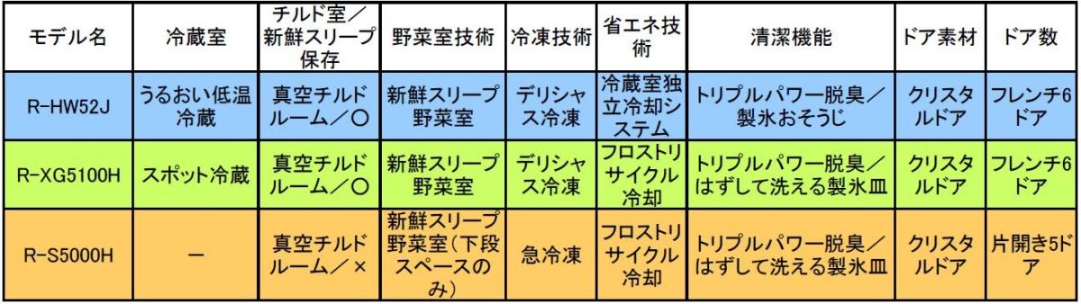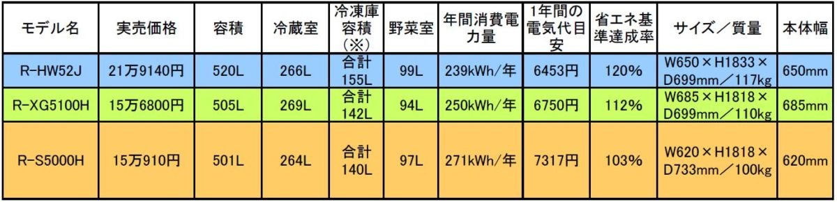 「HWシリーズは、上から2つめのグレードにあたるモデルです。同社で初めて『幅685mm・602L』『幅650mm・520L』を達成しました。このモデルのみ『冷蔵室独立冷却システム』搭載の新仕様で、チルド保存したい食品が多いご家庭にオススメですね。ちなみに最上位のWXシリーズは、引き出し部分が電動になっているのも違いのひとつです。色は3色展開。インテリアに合わせて選びやすいですが、容量が2種類なのでより大きな容量が欲しい場合は上位のWXシリーズを選択して下さい。