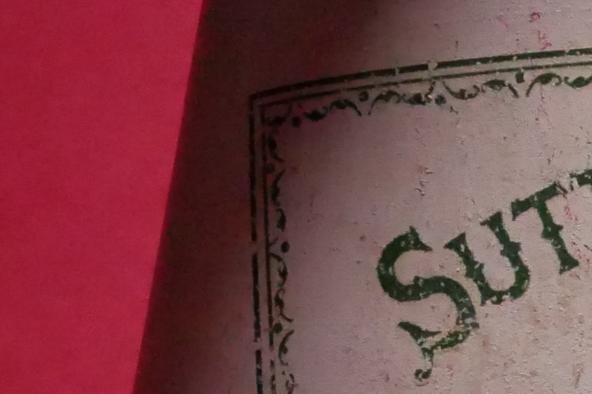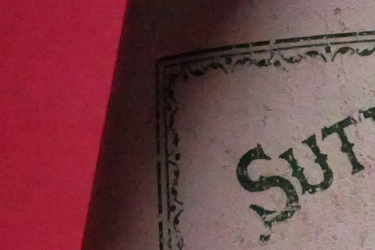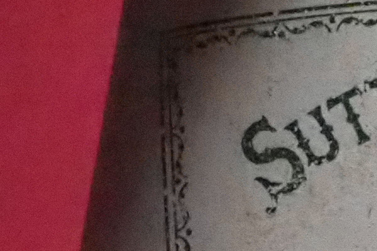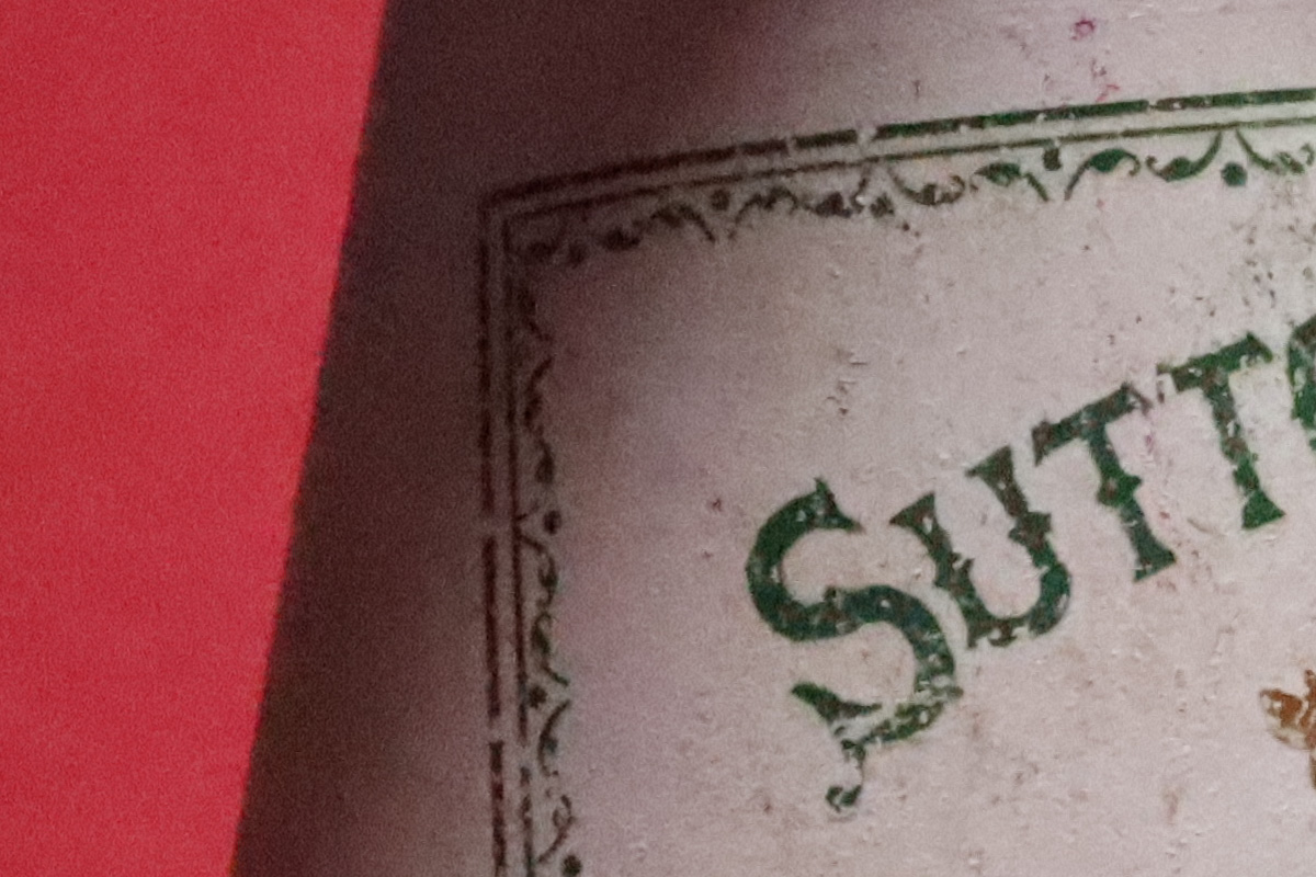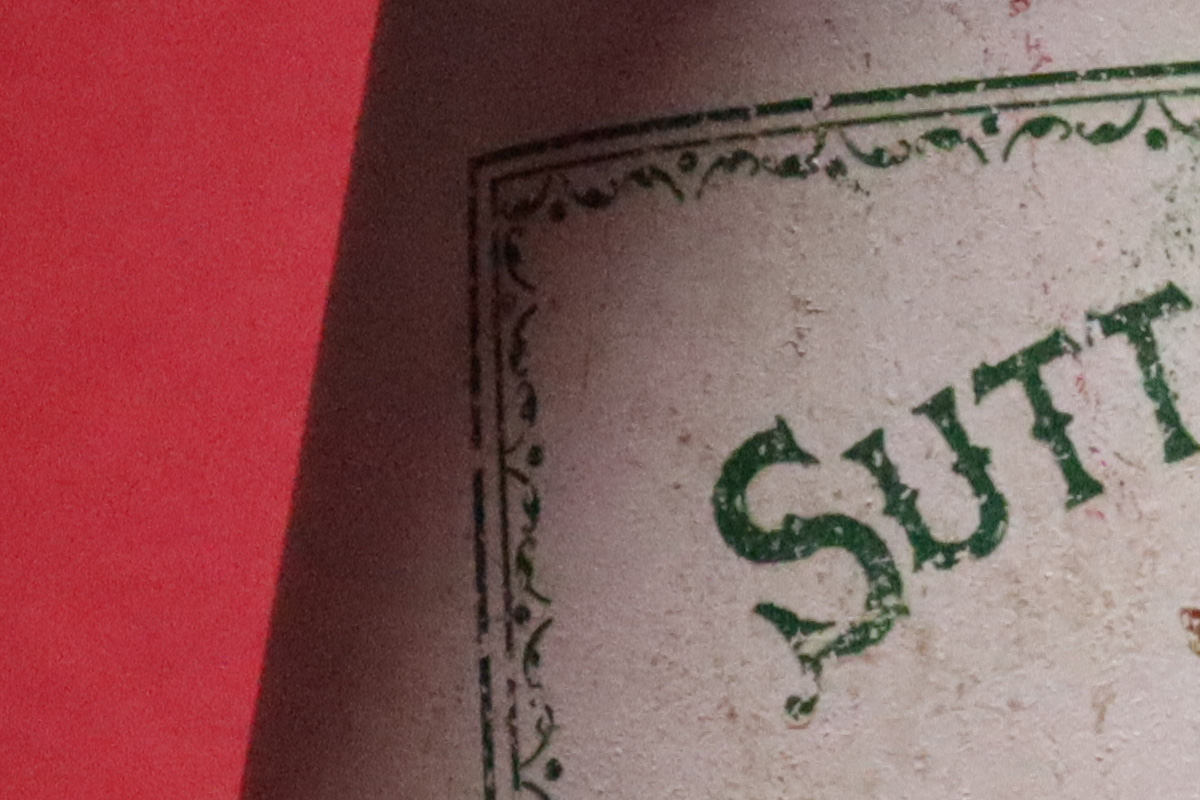 室内の静物撮影では、ノイズリダクションが強めの傾向を感じます。ISO6400の段階ですでに細部がつぶれています。シャープネスも強め。ISO12800やISO25600は、ザラザラとした輝度ノイズは抑えられていますが、色ノイズがやや目立ちます。