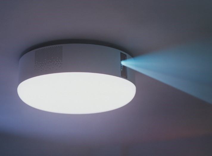 プロジェクタ一、サウンドシステム、シーリングライトが一体となった寝室での使用を想定したアイテム。40インチ~120インチ以上のスクリーンを投影できるプロジェクターを搭載し、寝室に最適な明るさでYouTubeやAbemaTVなどの様々なコンテンツを楽しめます。プレゼンターの徳井さんは「壁に時計を映し出したりとか、景色とか、世界の絵本とか。NetflixとかAmazon プライム・ビデオ(も楽しめる)」と紹介。続いて、徳井さんは「フォトメモリーズ」という写真のスライドショー機能で、猫とオザ(同居するスピードワゴンの小沢一敬さん)の写真を披露しました。さらに、雨上がり決死隊の駆け出し時代のコントが映写され、司会のお二人がはにかんだところで「家電芸人」コーナーは終了。