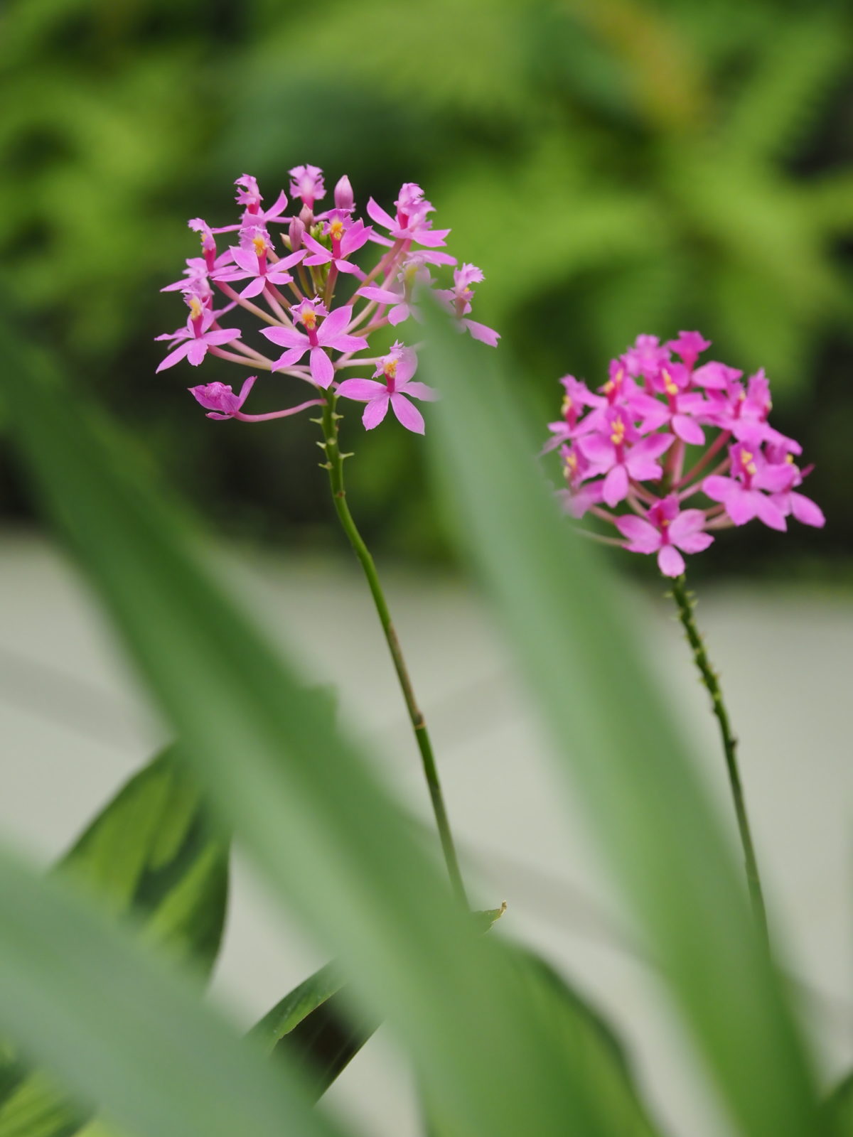 温室内の可愛らしいピンク色のランの花。細長い茎の特徴を伝えるため、縦位置に構えて撮影する。縦位置グリップ一体型のOM-D E-M1Xなら、横位置とさほど変わらないホールディングや操作感で撮影できる。